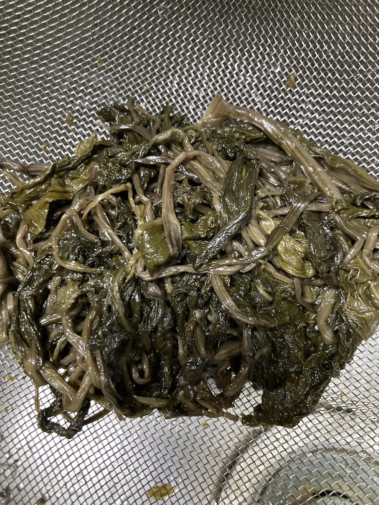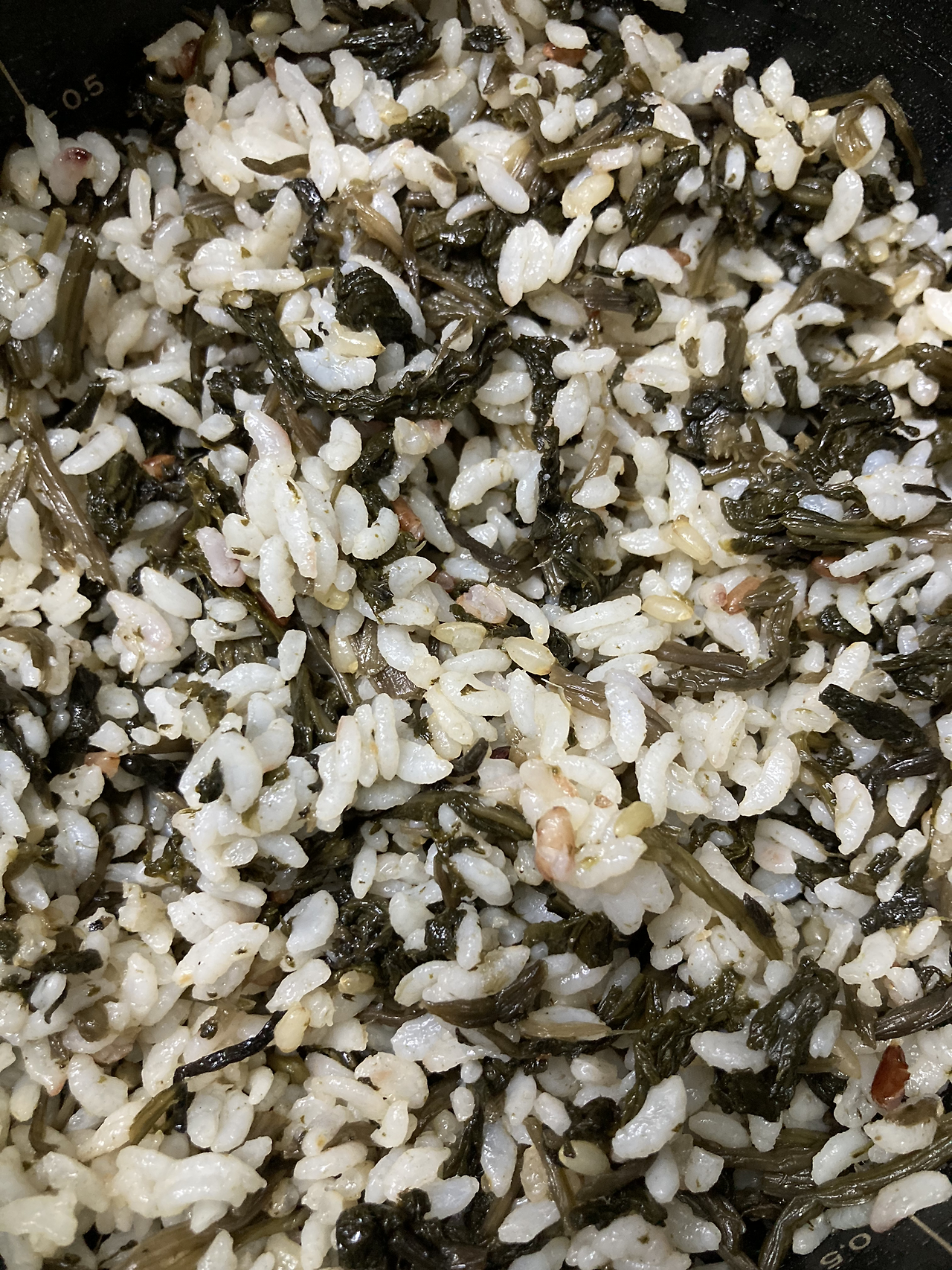줄기와 잎을 따로 먹어봅니다. 줄기는 약간 질긴 듯하고 잎은 뭉개지지 않아서 괜찮습니다. 잎과 줄기 물성이 다른데 둘의 질감을 찾느라 여러 시행착오를 겪었으리라 싶습니다. 줄기의 약간 질긴 듯함을 기억하고 1-1.5cm으로 잘랐습니다. 쭈유와 소금만으로 간한 후 찬밥(생쌀 100g, 밥 230g)과 버무려 섞었습니다. 섞어놓고 보니 생쌀 150g이면 충분하겠다 싶습니다.