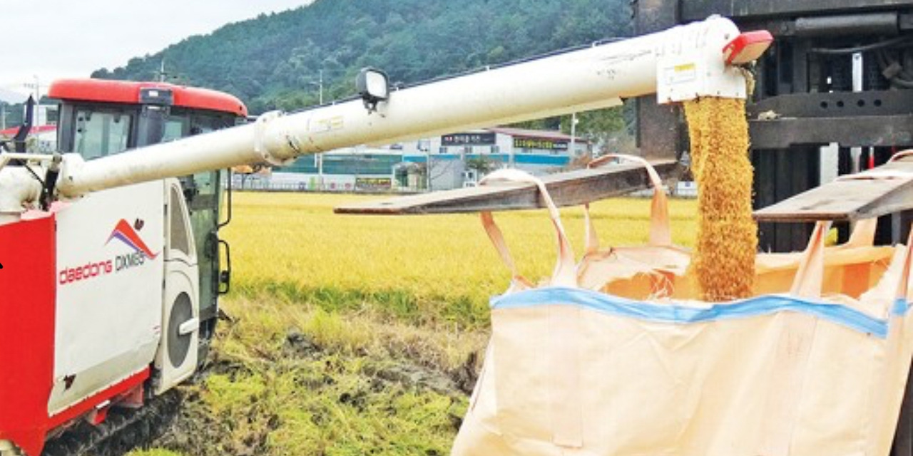 콤바인으로 수확 탈곡한 생 벼는 자루 등에 넣어 건조기가 있는 시설에 운반하고, 신속하게 건조 작업을 한다.