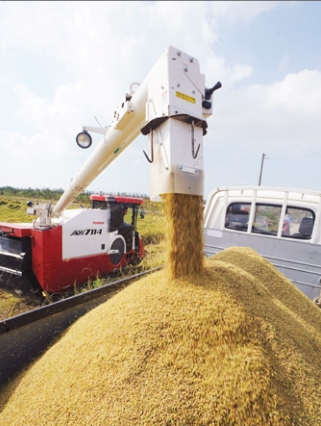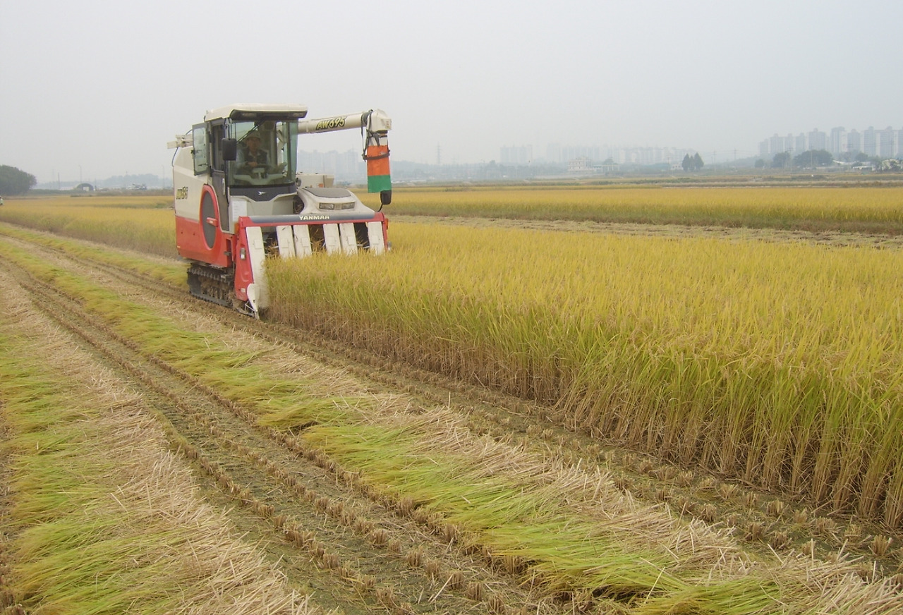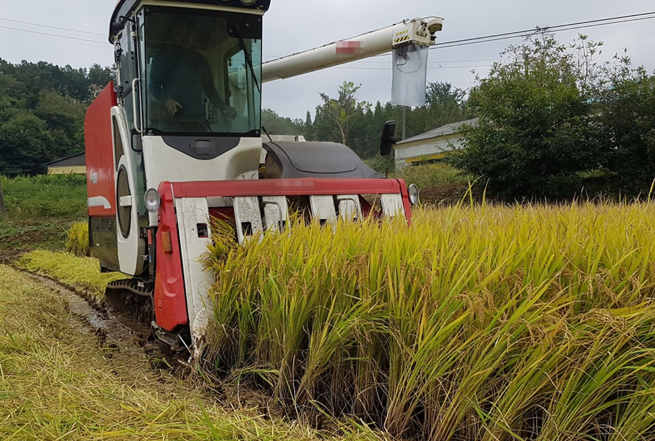 수확시기가 된 벼는 콤바인으로 수확한다. 콤바인은 벼 베기 기능과 이삭에서 벼를 떨어 뜨리는 타작 기능을 결합한 자주식 기계이다.