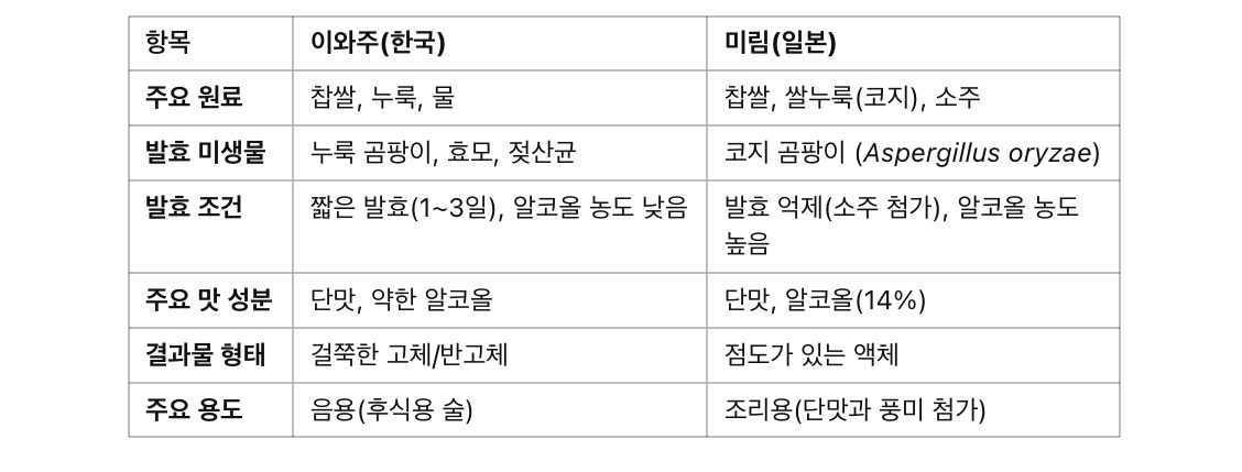 이화주와 미림은 각각 한국과 일본의 전통 단술로, 곡물 발효를 통해 단맛과 알코올을 생성합니다. 두 술은 발효 원리가 유사하지만, 재료와 발효 과정, 용도에서 차이가 있습니다.