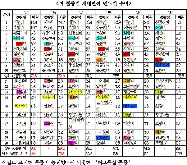 게다가 ‘벼 품종별 재배면적 연도별 추이’ 현황 자료에 따르면 ‘최고품질’ 품종의 2018년 재배면적은 전체 벼 재배면적의 약 22.5%에 불과하다. 5년 전인 2014년은 22.7%로, 매년 20% 내외의 비슷한 수준이 유지되고 있다.