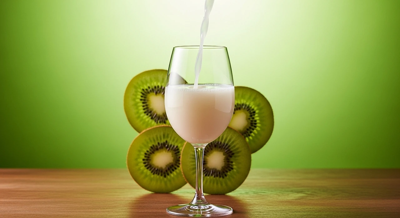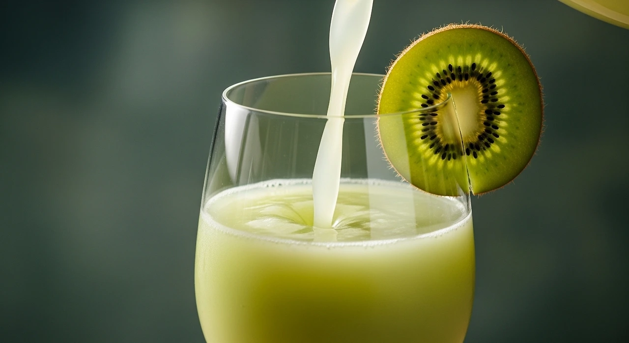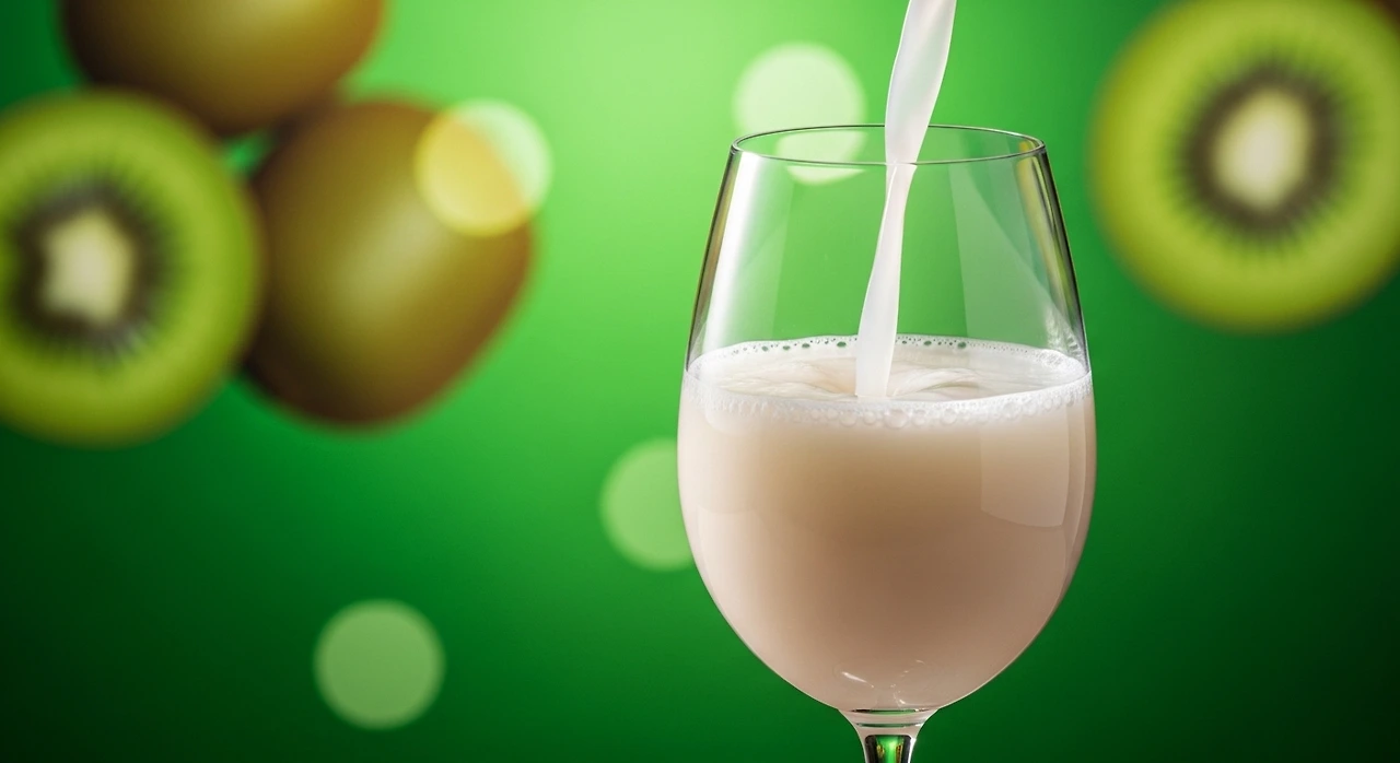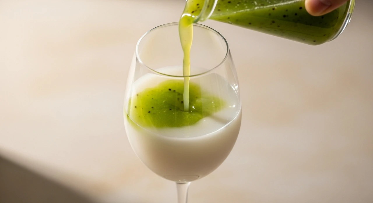 3. 하얀술 파우더 1병에 키위 주스를 병 라벨 아래까지 붓고, 뚜껑을 꼭 닫아 거꾸로 뒤집어 잘 섞어줍니다.