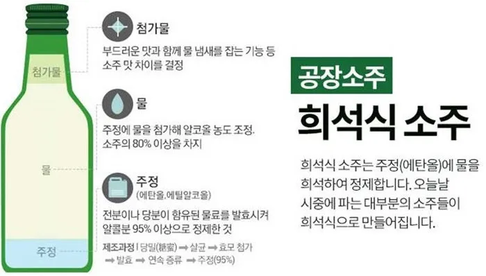 • 희석식 소주 = 주정 + 물 + 감미료 + 첨가물