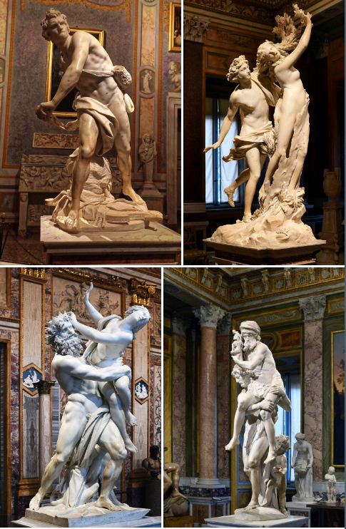 "1", Aeneas, Anchises, Ascanius (1619 : 불타는 트로이에서 탈출하는 가족), "2", #프로세르피나의 강간(1621-22 : 여자를 붙잡는 순간), "3", #아폴로와 #다프네(1622-1625 : 다프네의 몸이 나무로 변하는 순간), "4", #다비드(1623-24 : 다비드가 몸을 비틀어 골리앗에게 슬링을 발사하는 순간)이며 네 작품 모두 이탈리아 로마의 #보르게세 박물관 소장품이다.