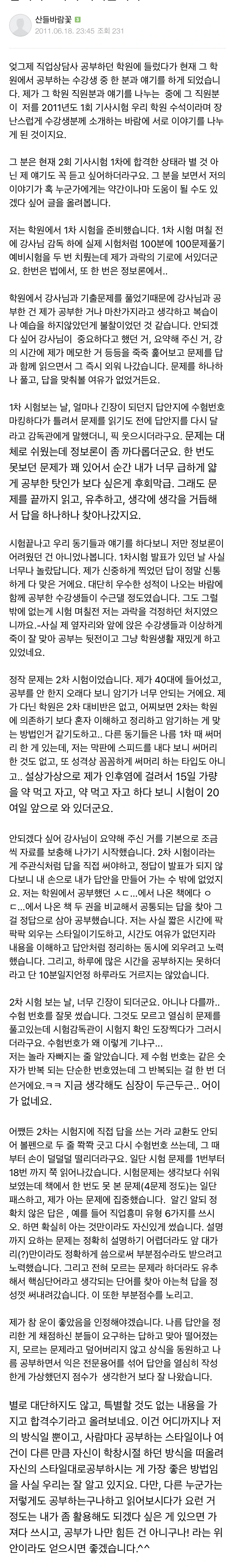 그때 한 달이었던가.. 짧은 학원 수강을 마치고 자격증 취득 후 카페에 올린 합격수기.. 대단한 것도 아닌데 수기를 써서 올렸다는 것도 재밌지만 그걸 다시 접했다는 게 너무 놀랍다. 덕분에 그때 생각도 나고, 접혀있어 있는 줄도 몰랐던 내 삶의 한 페이지를 찾은 것 같아 기쁘다.