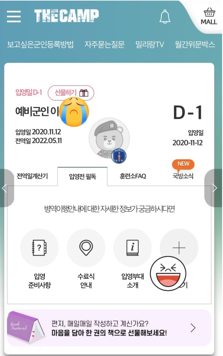 그렇지만 나도 아들의 입대 전날 군대 앱에 가입했다. 글은 안 달아도 나도 울 아들 사진은 봐야 하니까. 더 캠프. 기계치라 아들이 가입해줬다. 찬찬히 보면 할 수 있는데 혹시나 실수해 아들에게 피해가 갈까 싶은 마음에 부탁들 했다. 닉네임 고르는데만 10분은 걸린 듯. SNS에서 사용하는 닉네임을 넣었더니 다 이미 사용 중이란다. ~~ 맘이 너무 많아. 다른 건 수월하게 가입이 됐다.