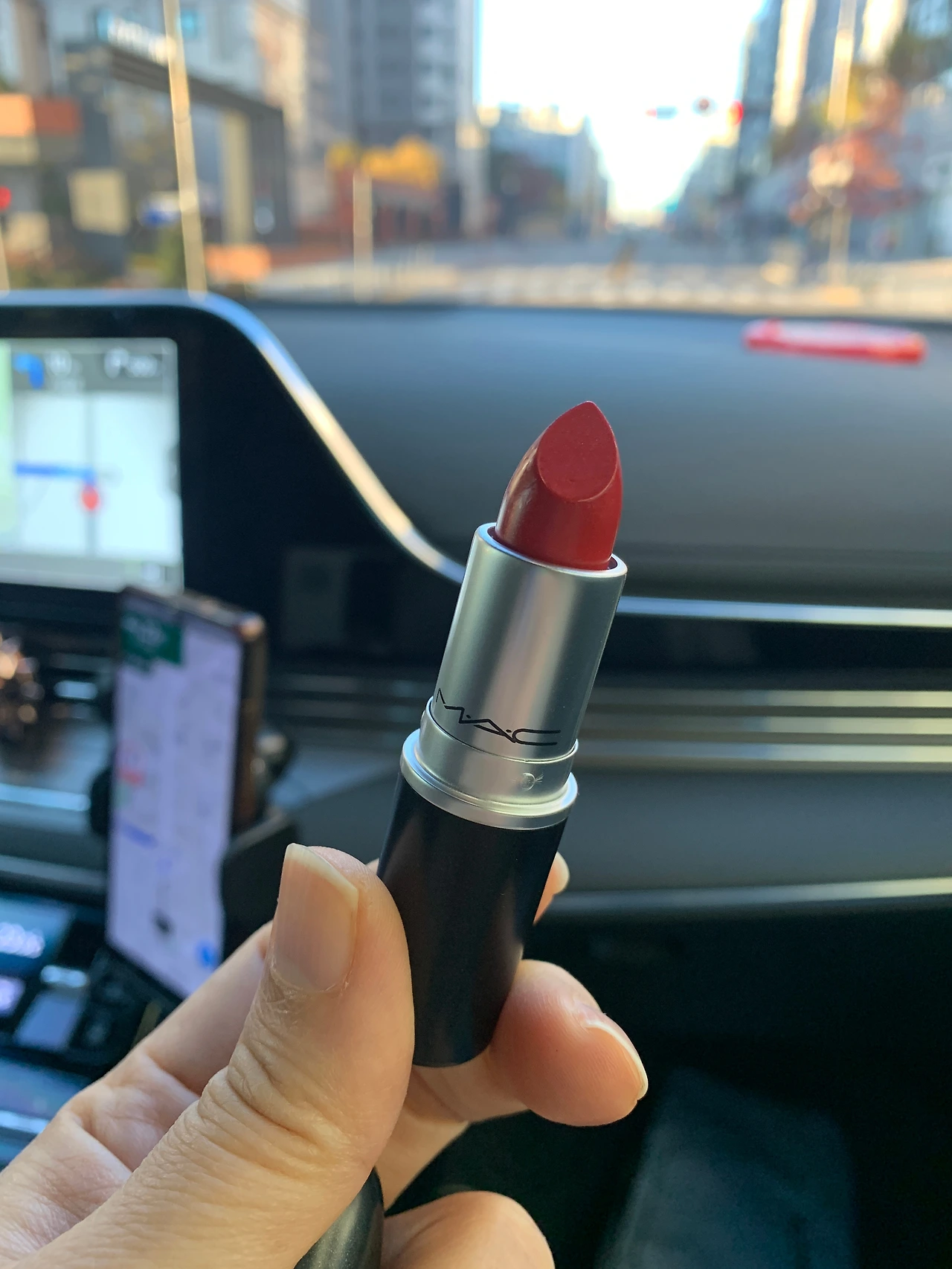 ”립스틱 하나 샀어. 너무 빨간가? 발라봐. “