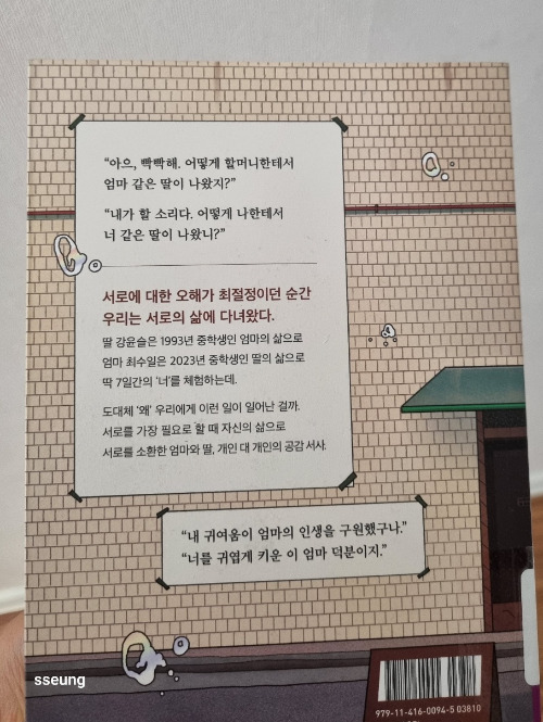 그런데 역시나! 재밌었다. 우리 모녀와 딱 1살씩 차이나는 또 다른 모녀의 이야기였다. 2023년에 중1이었던 딸 강윤슬, 1993년에 중1이었던 엄마 최수일. 24년에 중1이었던 땡글이, 94년에 중1이었던 나, 현재 땡글이 엄마.
