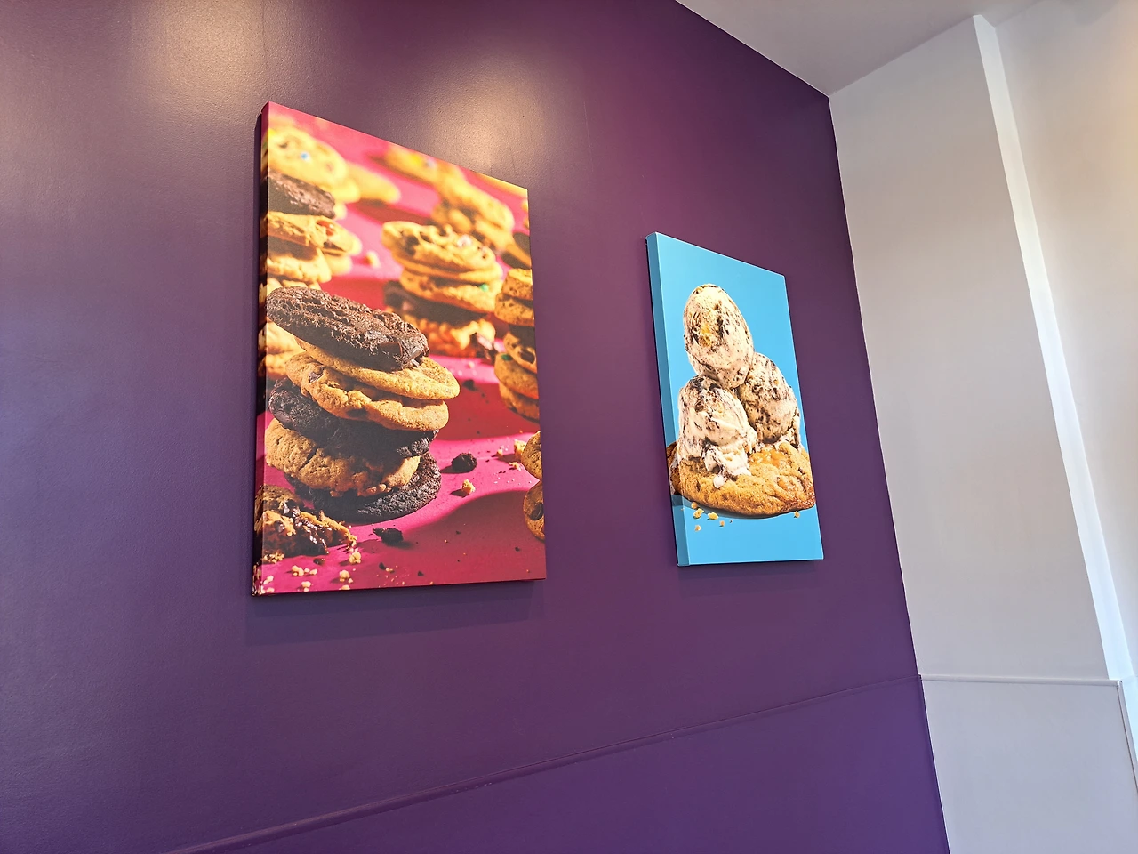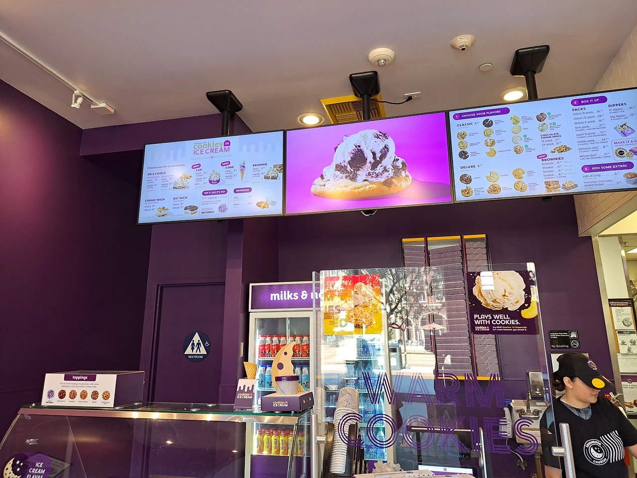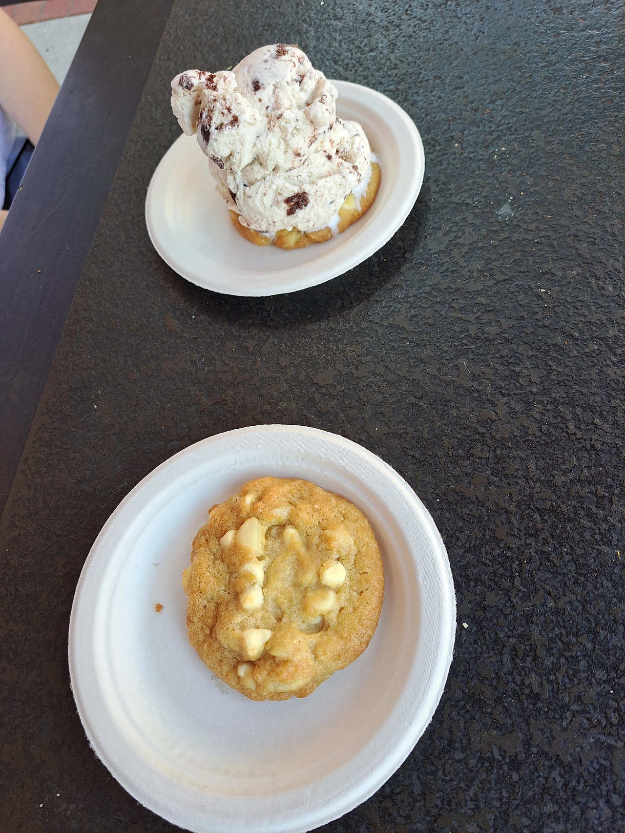 마카다미아 쿠키 위에 오레오 칩 아이스크림을 얹은 세트. 초코칩 쿠키가 갓 구워져 나온다.