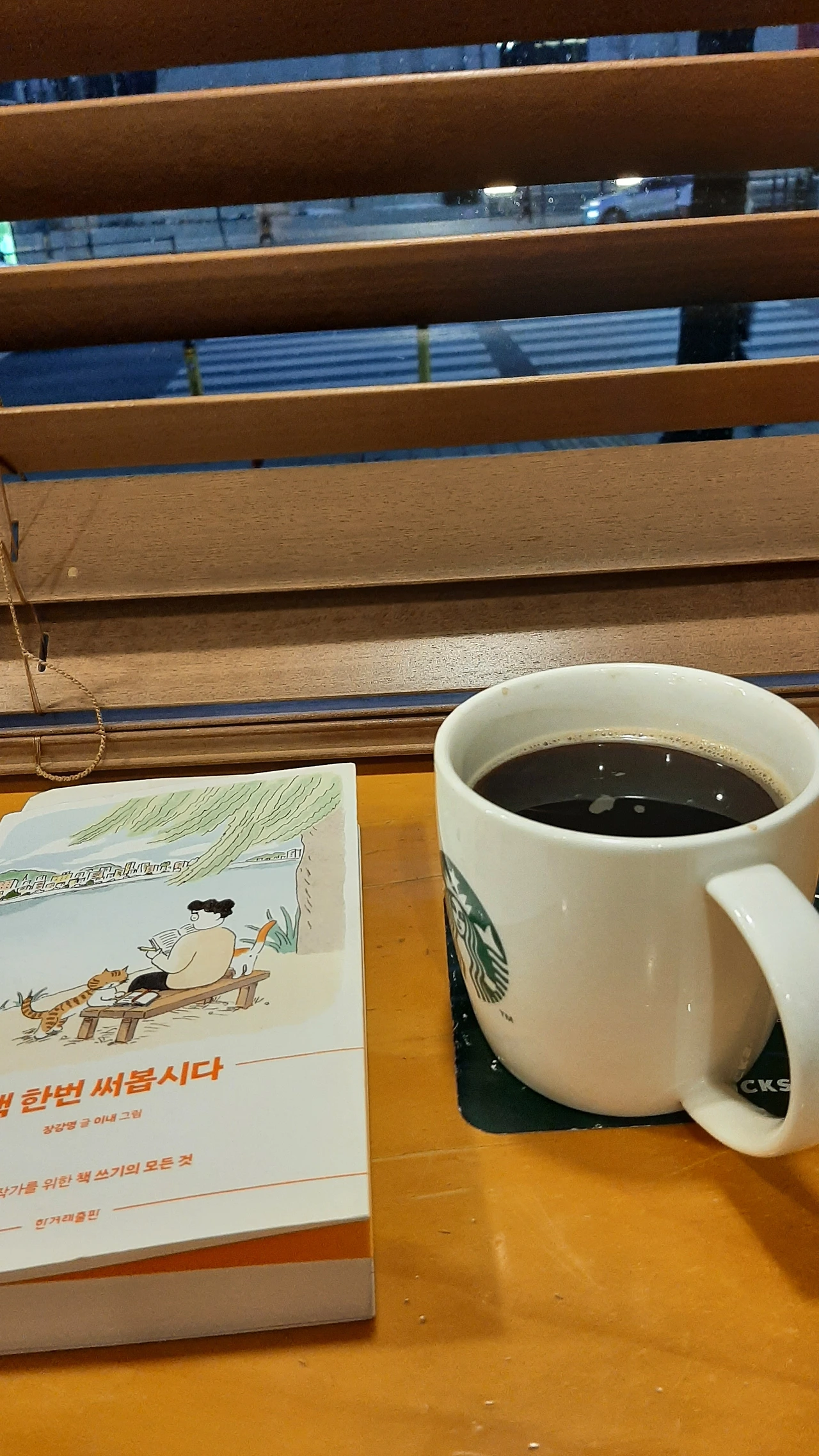 프랜차이즈 커피점의 노말커피 한잔과 책 한 권을 창가 키 높은 의자에서.