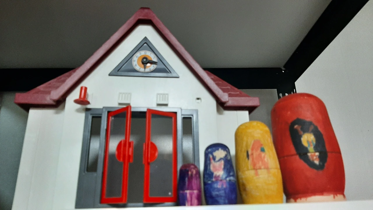 철제선반 맨 위칸. 놀릴 수는 없어 잡히는 대로 놓았다.