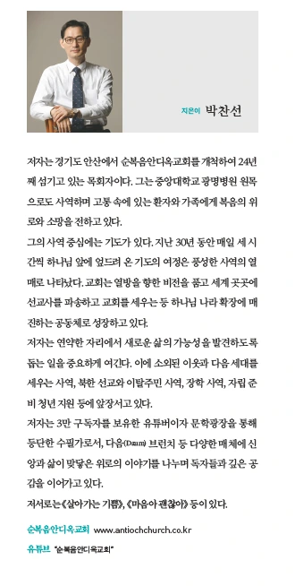 그렇다면 이 책은 다시 숨을 쉬게 하는 책이 될 것입니다. 기도는 하늘을 움직이는 능력입니다. 그러나 그보다 더 먼저 기도는 우리의 영을 하나님의 마음에 연결시키는 통로입니다. 이 책이 누군가의 기도를 다시 살리고 누군가의 인생의 판을 바꾸는 작은 불씨가 되기를 소망합니다. 그리고 그 불씨가 한 사람에서 시작되어 가정으로, 교회로, 열방으로 번져가기를 기도합니다.