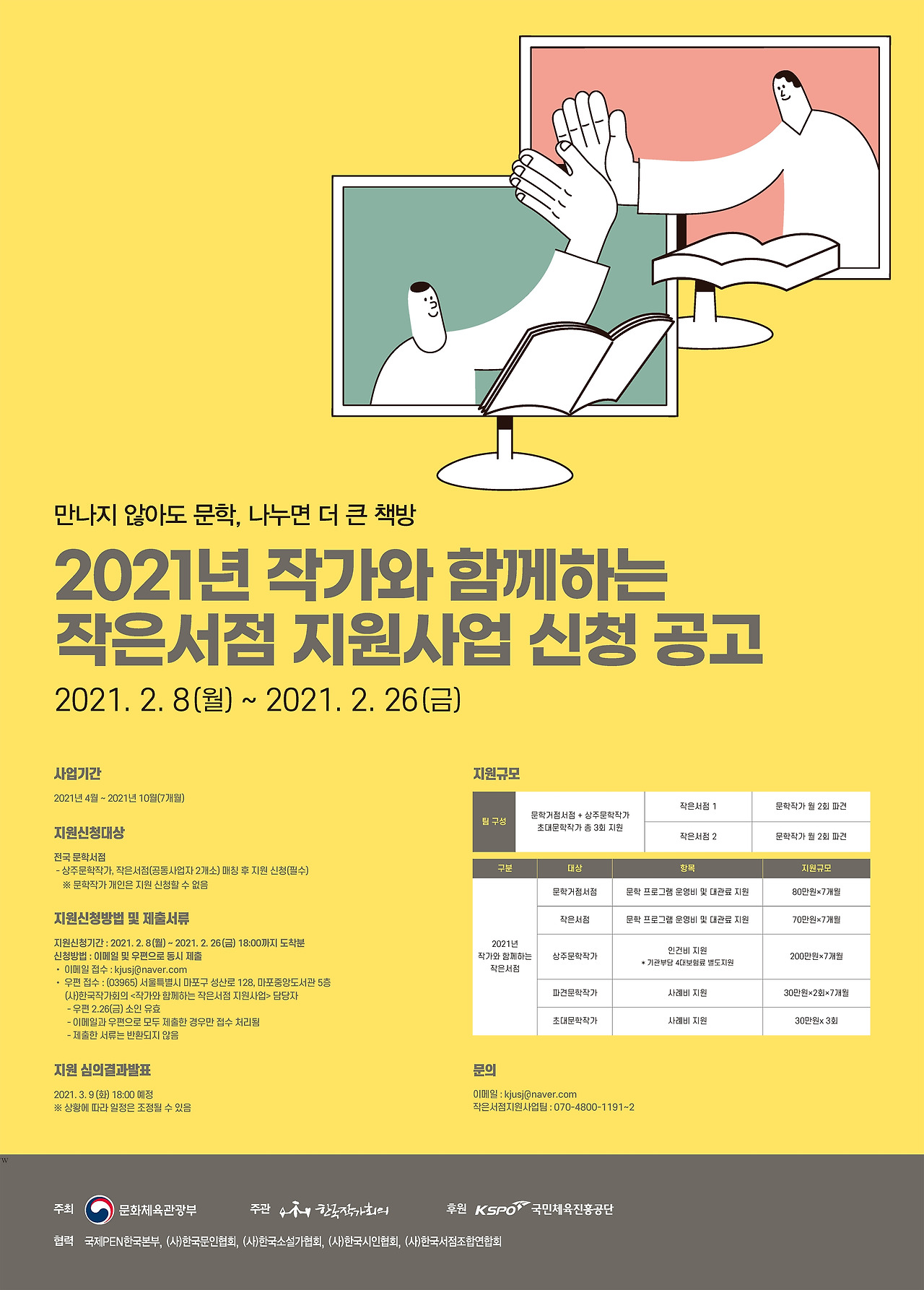우야든동, “작가와 함께하는 작은서점 지원사업”은 꽤나 규모가 있는 지원사업이다 보니 욕심을 내볼 만하다. 문학거점서점과 작은서점 2개소에 각각 7개월간 매달 80만원의 프로그램 운영비를 지원하고, 이 프로그램을 운영할 코디네이터인 ‘상주문학작가’의 인건비와 4대보험료를 지원해준다. 그뿐이랴, 월 2회의 파견문학작가 사례비 30만원도 지원해준다. 자체적으로 다양한 프로그램을 진행중인 동네책방이라면 도전하지 않을 이유가 없다.