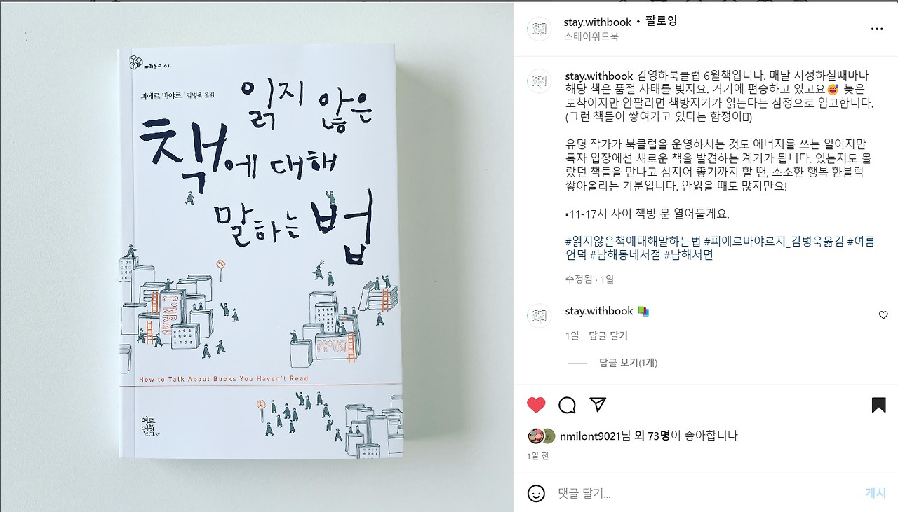새로 입고한 책들을 소개하거나, 특정한 책에 대해 소개하는 피드는 많다. 그런데 경상남도 남해의 동네책방 '스테이위드북'의 피드에서는 꽤 재밌는 언급을 확인할 수 있었다. "김영하 북클럽 6월책입니다. 매달 지정하실 때마다 해당 책은 품절 사태를 빚지요. 거기에 편승하고 있고요."라는 발언을 접하면서, '00선정도서'란 것의 힘이 참 대단하는 생각을 해봤다.