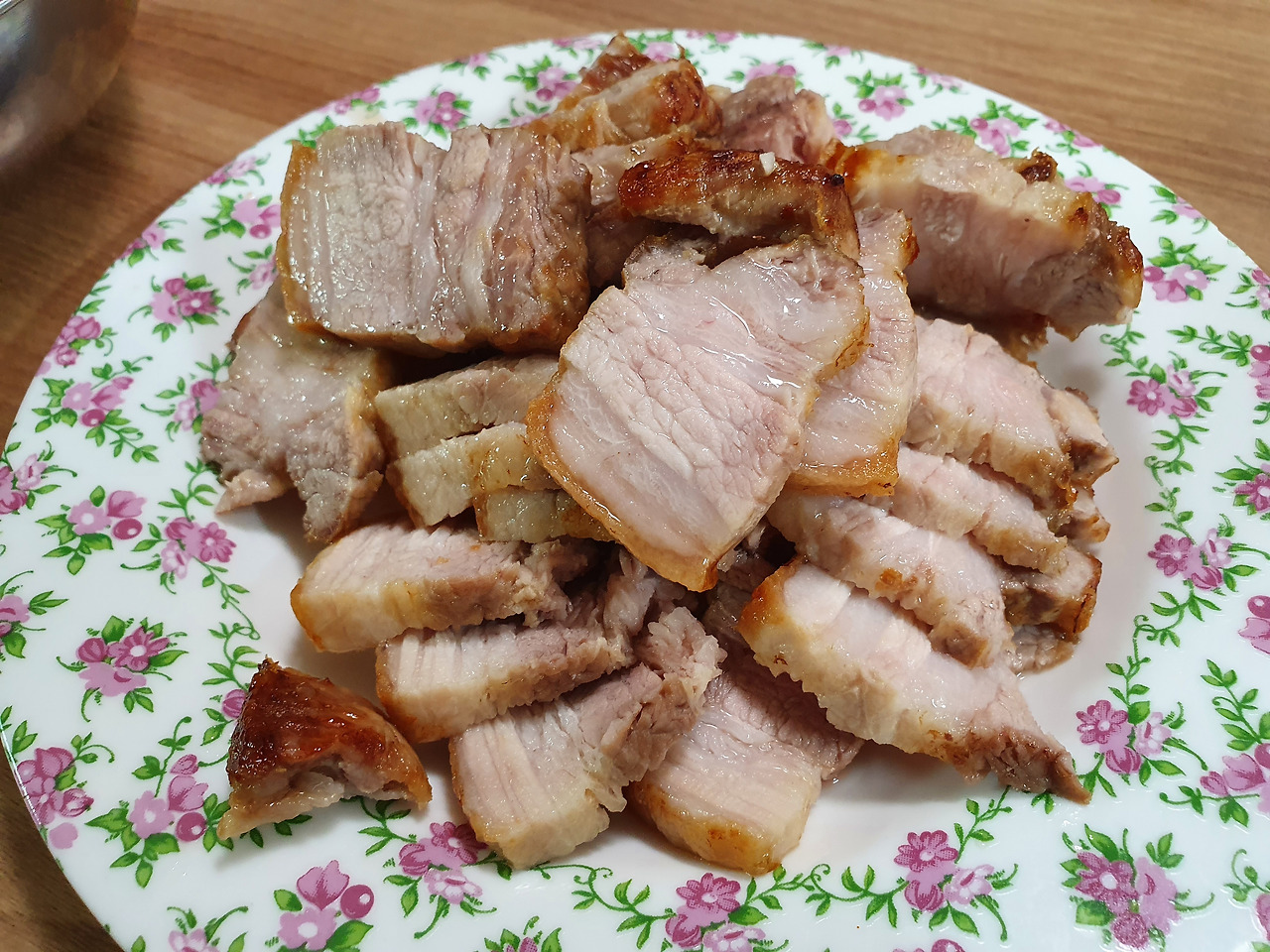 에어프라이어에 겉바속촉으로 구운 삼겹살과 겉절이(<무한도전> 끝난 지가 2년이 넘어가는데, 정준하가 떠오르다니) 조합이 신박했다. 혈관 속을 마구 질주하는 돼지고기 육즙이, 늦은 토요일 밤 주저주저하는 내게 달리기를 하고 오라고 울부짖는다. 궈궈~