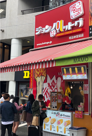도쿄 멋쟁이들이 찾는 고급 브랜드 거리인 오모테산도. 그 오모테산도 초입의 메이지진구마에역(明治神宮前駅)은 10대의 성지 하라주쿠와도 매우 가까운 핫플레이스입니다. 이 메이지진구마에 역 7번 출구 앞의 ‘종로 치즈 핫도그’라는 가게 있죠. 생긴 지 몇 년 되지 않는 신상 가게입니다. 가게 앞에 한글로 ‘종로’와 한자로 ‘원조(元祖)’라고 힘주어 강조합니다. 물론 서울 종로에 이런 가게는 없습니다. 종로에는 물론, 명랑 핫도그는 있죠.