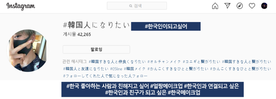 #한국인이_되고_싶어라는 뜻의 #간코쿠진니_나리타이(韓国人になりたい)등의 해시태그 게시물도 제법 됩니다.