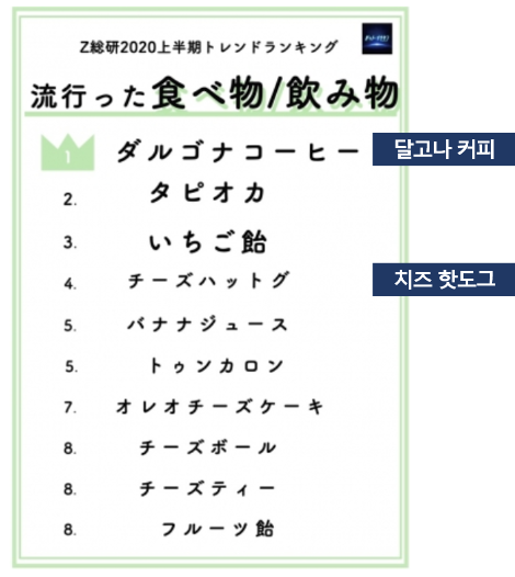 ‘치즈 핫도그’는 여전히 강세입니다. 2020년 상반기에도 여전히 트렌드 4위 자리를 지키고 있습니다.