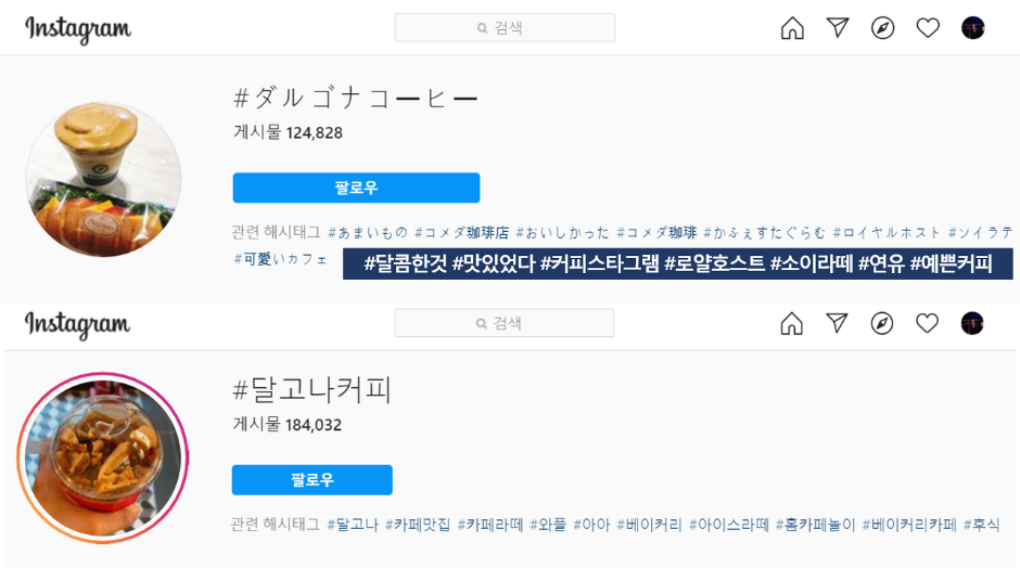 인스타그램에 #ダルゴナコーヒー #달고나 커피. 이렇게 두 가지로 검색했습니다.