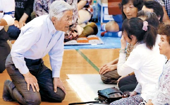 2016년 구마모토 지진 때, 임시보호소를 방문해 무릎을 꿇고 이재민의 아픔을 나눈 모습이 대표적이죠. 이게 처음이 아닙니다. 1995년 한신 대지진 때도 임시보호소를 찾아 슬리퍼도 신지 않고 바닥에 무릎을 꿇고 이재민과 마주했습니다.