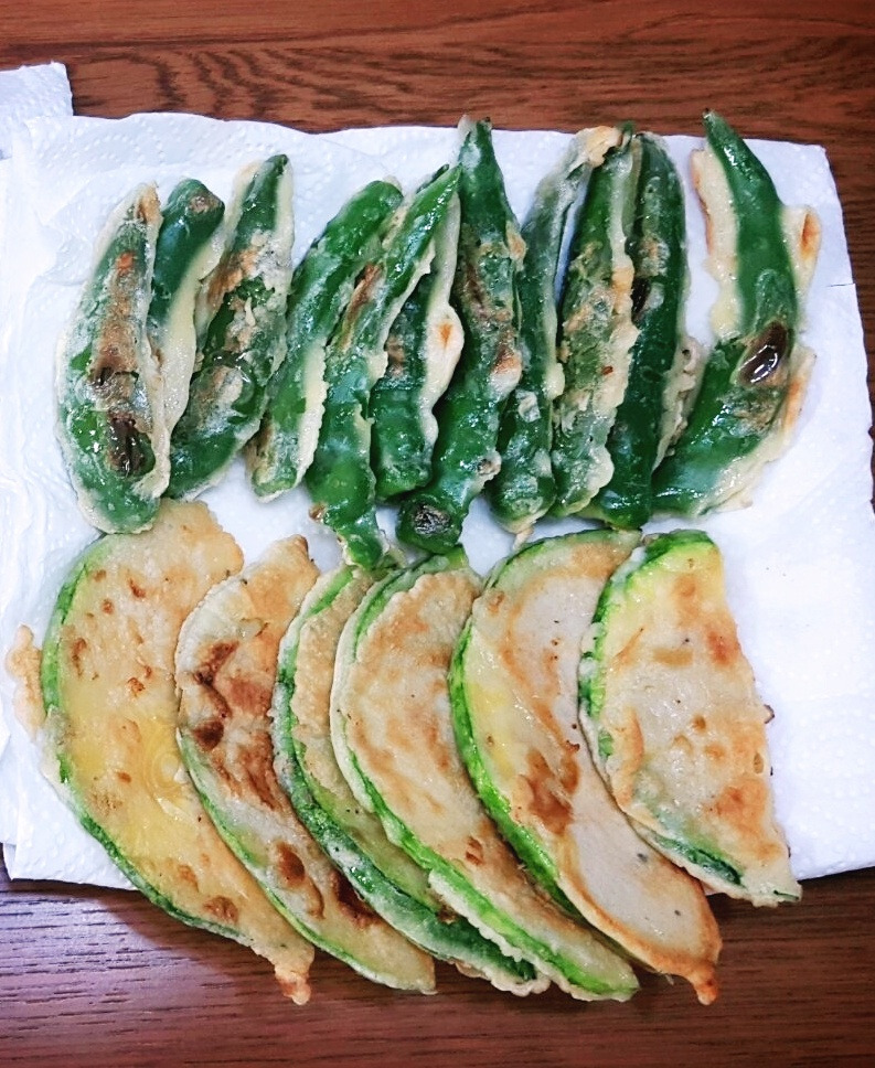 0.5cm 두께로 잘라, 소금을 뿌려 수분을 빼는 동시에 밑간이 베게 하고, 빠져나온 수분을 닦아 낸 뒤, 밀가루를 묻히고, 달걀을 묻혀, 식용유를 넉넉히 두른 프라이팬에 약한 불로 노릇할 때까지 부쳐내기! 아, 애호박 위에 홍고추를 어슷하게 썰어 장식으로 얹어 부쳤던가….