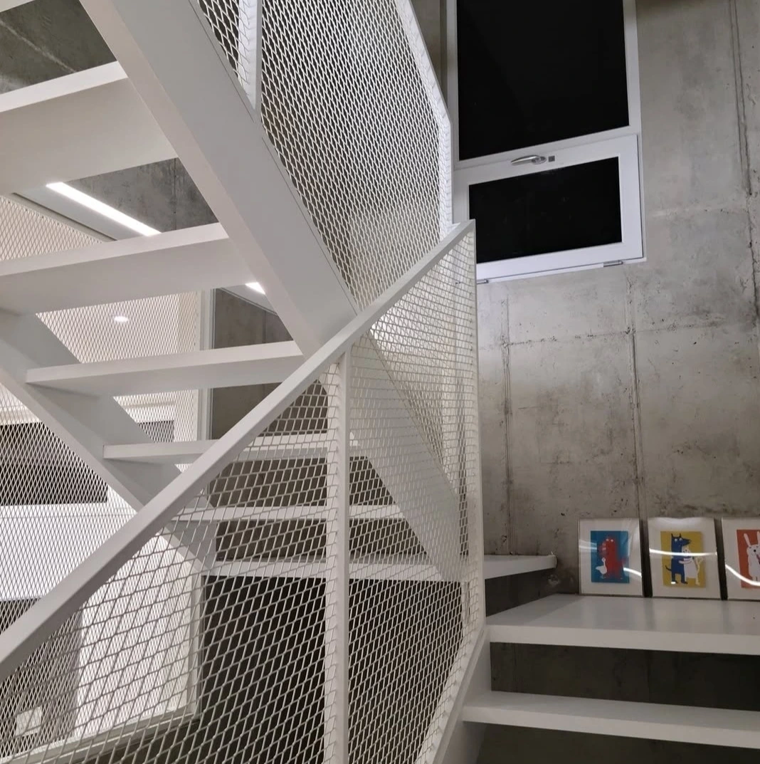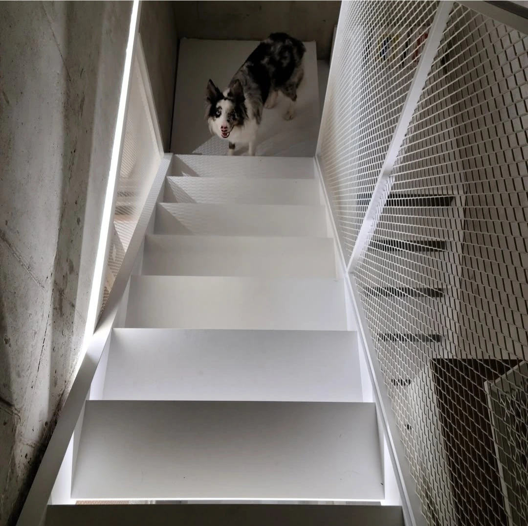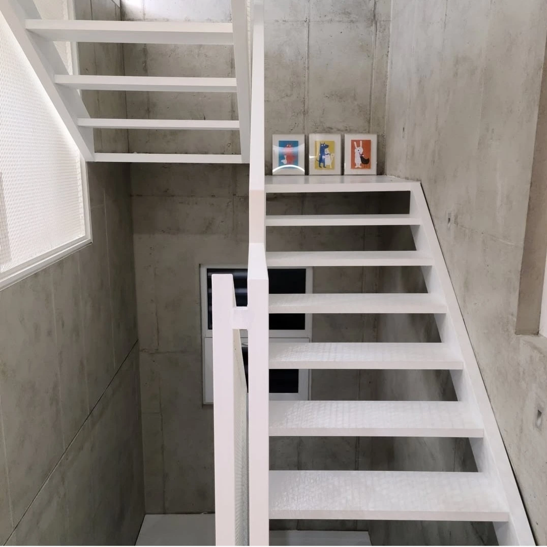 조금 더 개방감을 주기 위해 발판 일부를 과감히 생략했고, 난간은 시스루 느낌의 메쉬망을 적용해 모두 화이트 도장으로 마감했습니다.
