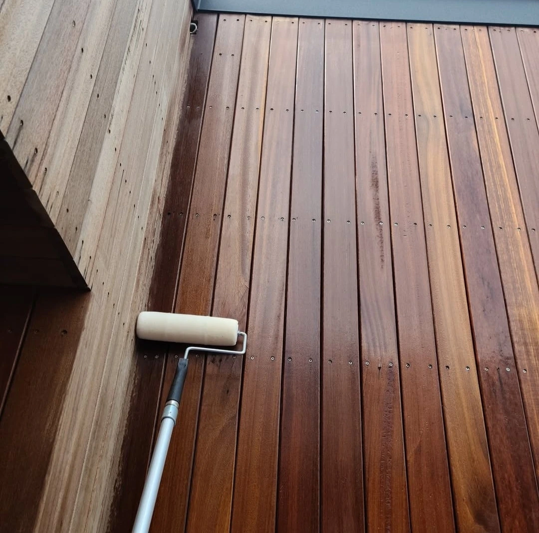 여름이 지나면, 장마와 강한 햇볕에 나무 색상이 바래고, 표면에 손상이 생깁니다. 그대로 두면 손상이 누적되기에, 저는 매년 가을마다 우드 표면에 오일 스테인을 2~3회 덧바르고 충분히 건조합니다.