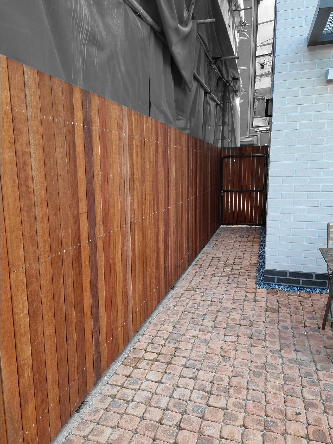 어차피 비워둬야 하는 공간이라면 좀 더 효율적으로 쓰는 게 낫겠다고 생각했습니다. 그래서 그 1m 공간에 집 앞에서 뒷마당으로 이어지는 통로를 만들고 문을 내어 생활의 편의를 더했습니다.