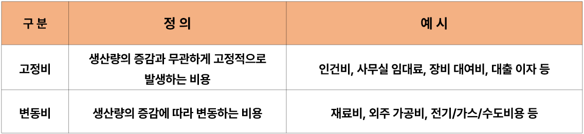 판매 증가에 따라 같이 증가하는 변동비와 고정적으로 들어가는 고정비를 모두 고려하여 영업이익을 예상할 수 있습니다. (매출 = 고정비 + 변동비 + 영업이익)