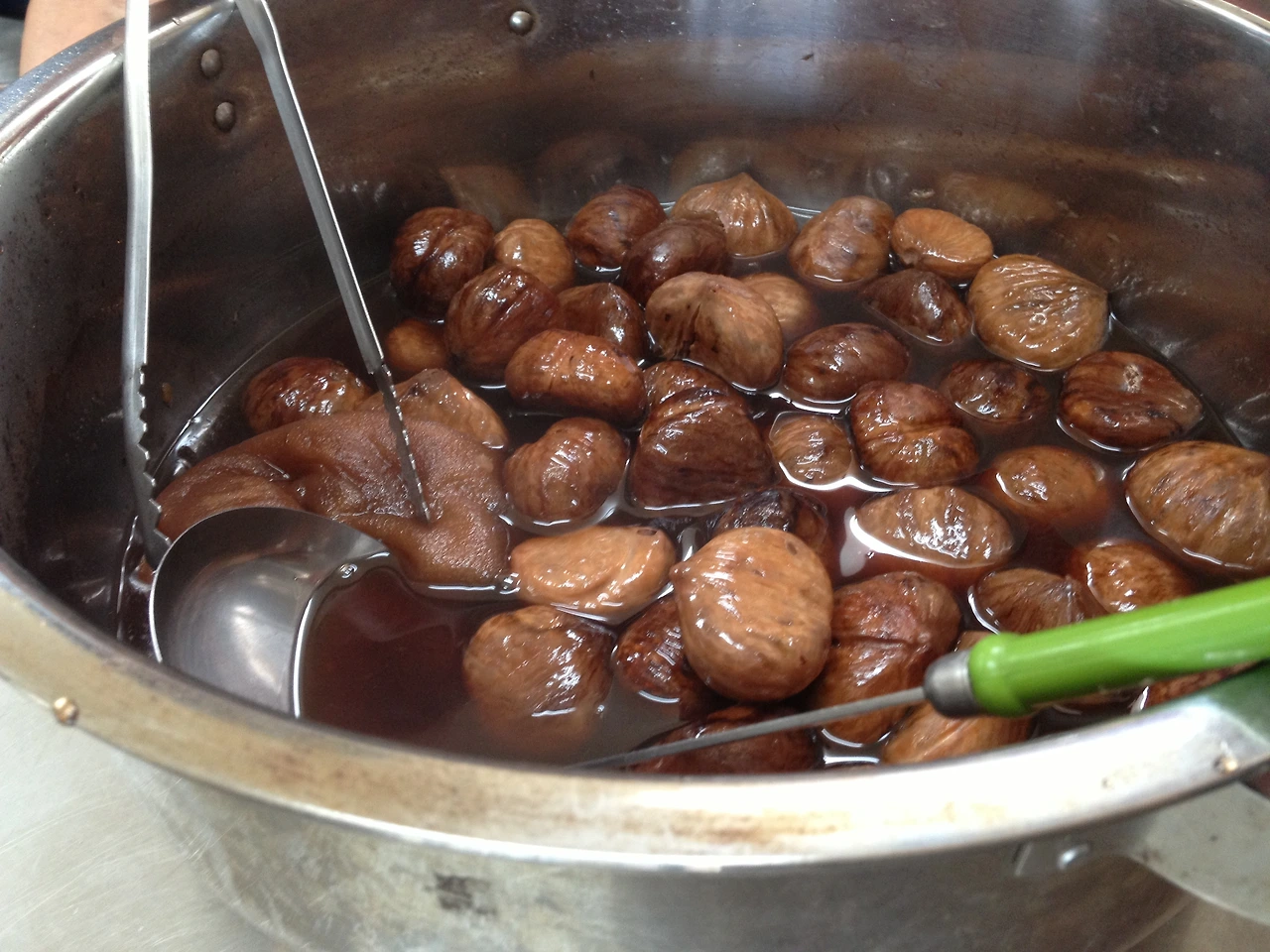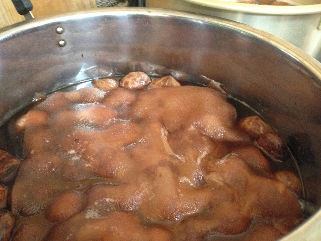그렇게해서 아주 얇은 껍질만 남은 밤들을 베이킹파우더와 설탕을 넣은 냄비에 넣고 약불에 오랫동안 끓이기 시작했어요. 하루 안에 끝나는게 아니더라고요. 2-3일은 그렇게 끓이고 졸이기를 반복한 것 같아요.