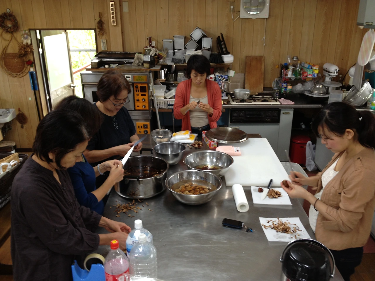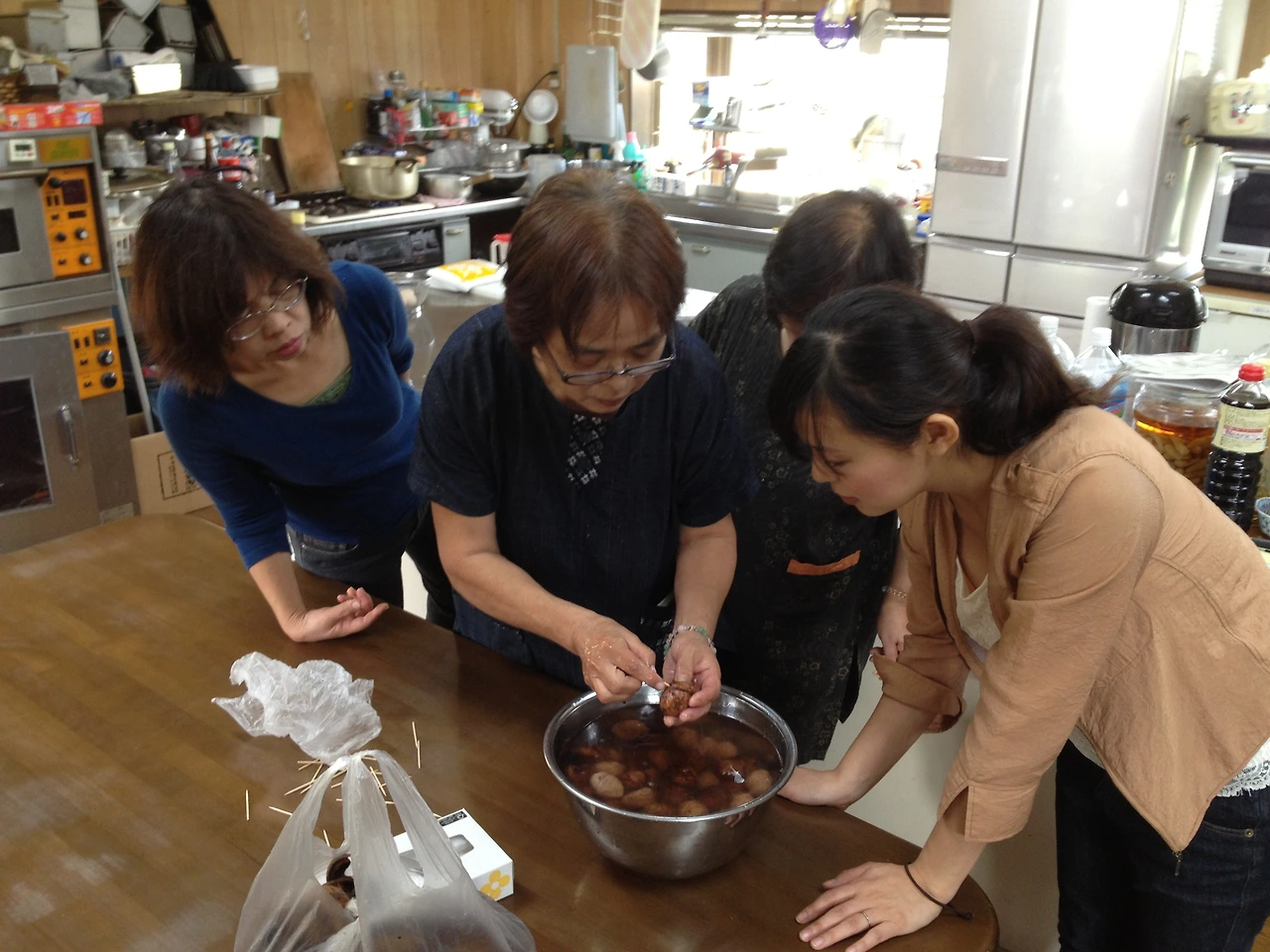 무더운 여름이 지나고 날씨가 선선해지기 시작한 어느 토요일이었어요. 아케미 아주머니가 빵을 판매하는 아침장이 끝날 무렵에 한 손님이 산에서 직접 딴 밤을 가져다 주셨어요. 이를 보고 옆에서 ’점심으로 밤밥을 해 먹자'라는 분이 계셨고요. 이에 아케미 아주머니가 “시부카와니(渋皮, 보늬밤)도 함께 만들자”고 하시네요. 그리고서는 아침장이 끝난 뒤 바로 공방에서 즉석 보늬밤 워크숍이 시작됐어요.