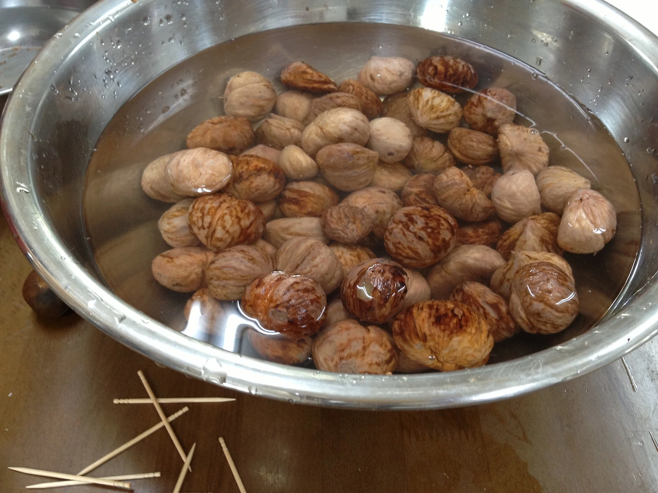 먼저 밤을 미지근한 물에 담가 불려줘요. 그리고는 작업대에 둘러서서 하나씩 까주고요. 밤밥도 해먹기로 해서 껍질을 완전히 깐 노란 밤은 햅쌀과 함께 밥통에 넣었어요. 그리고 속껍질을 남긴 밤은 다시 미지근한 물에 넣어주고요. 그런 다음 물에 불려 부드러워진 밤의 껍데기 중간중간의 단단한 심들을 이쑤시개로 살살 긁어내는거에요.