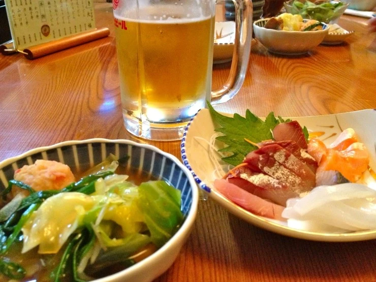 화덕 만들러 간 시마네에서의 마지막 밤. 화덕이 완성된 기념으로 미야자키 아저씨가 저녁을 쏘기로 했다. 장소는 아저씨의 단골 식당. 생맥주를 한 잔 시원~하게 마신 뒤 해물경단이 들어간 전골과 생선회를 먹으며 가게를 둘러봤다. 왠지 드라마 <심야식당>이 생각나는 곳이었다.