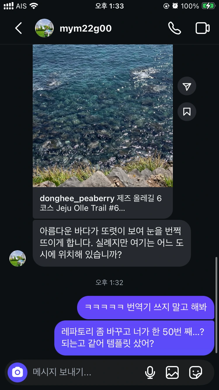 인스타그램에서는 보통 피드의 사진을 하나 골라 보내면서 오그라드는 번역기 말투로 '오우 이 아름다운 풍경에 나오는 곳은 어디예요우?'하고 알려달라고 한 뒤 주저리주저리 말을 이어간다.