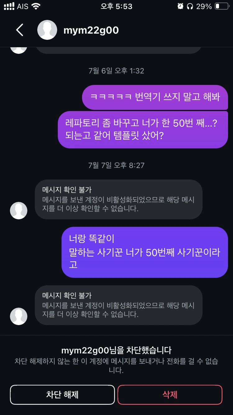 이제는 나도 익숙해져서 놀려보기로 하고 혹시 템플릿을 샀냐고 물어봤는데, 다음날 '네? 그케 무쓴 소리에요우?'하고 답장이 오길래 '너 같은 사기꾼 많이 봤다 아이가'라고 답했더니 이 놈이 계정을 아예 삭제하고 빤스런을 쳤다.