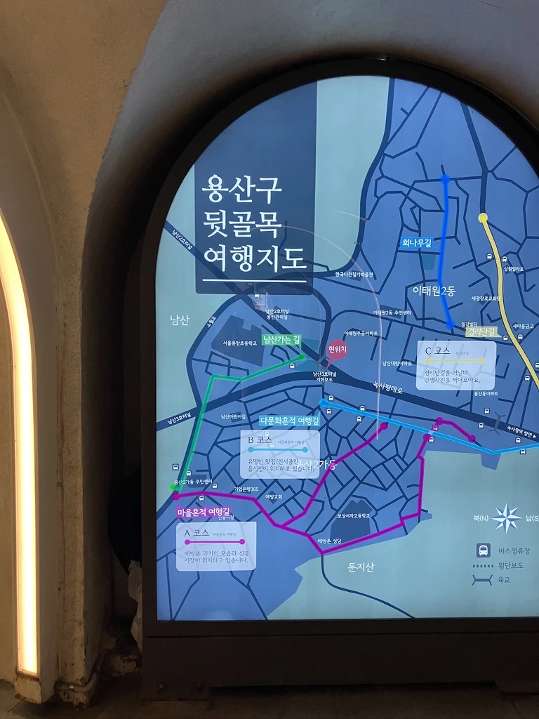 해방촌에서 녹사평 쪽으로 가는 길에 본 도보 터널 안에서는 용산구 뒷골목 여행지도라는 걸 발견했다. 언젠가 이 지도를 따라 돌아보고 싶다.