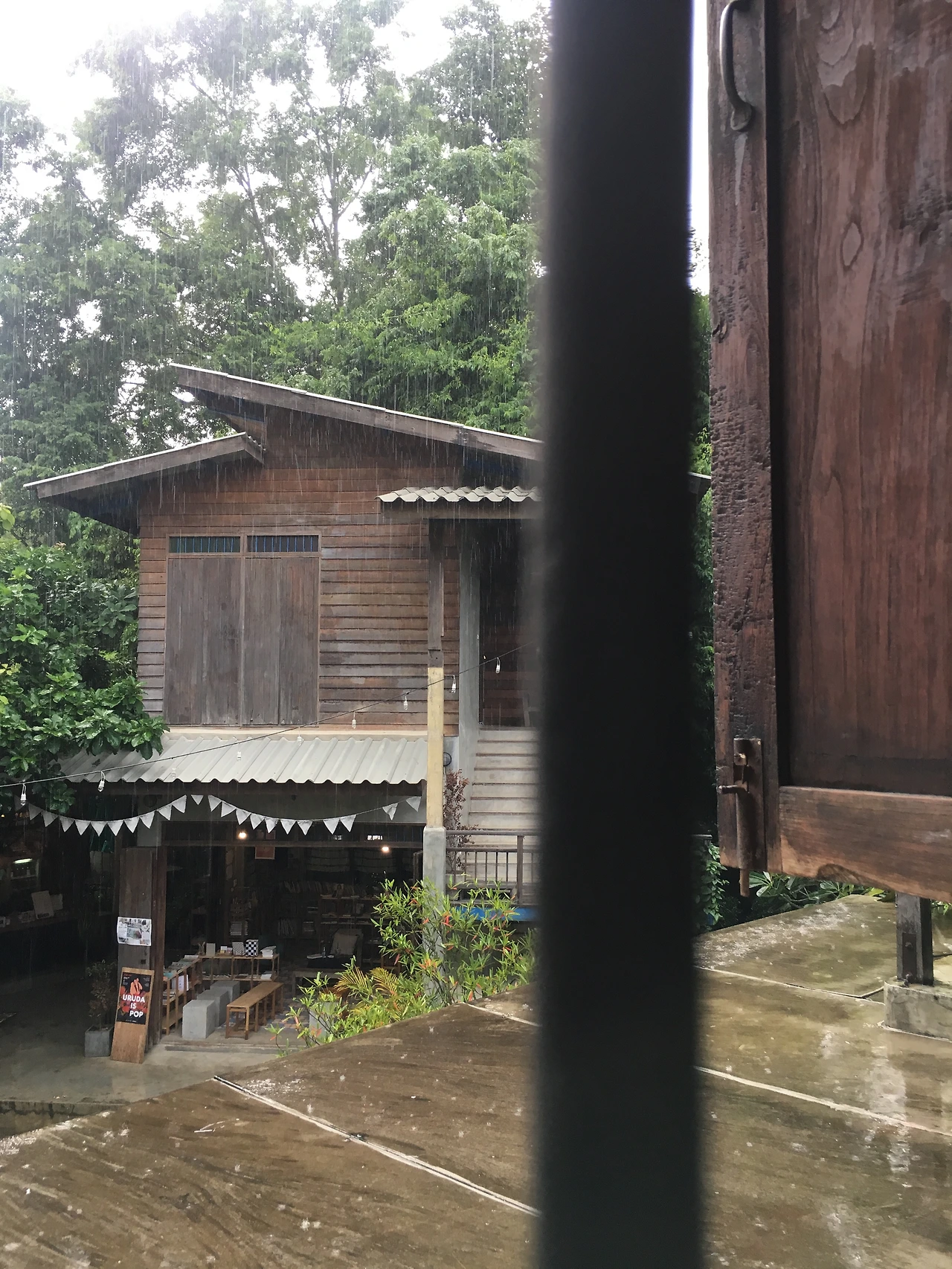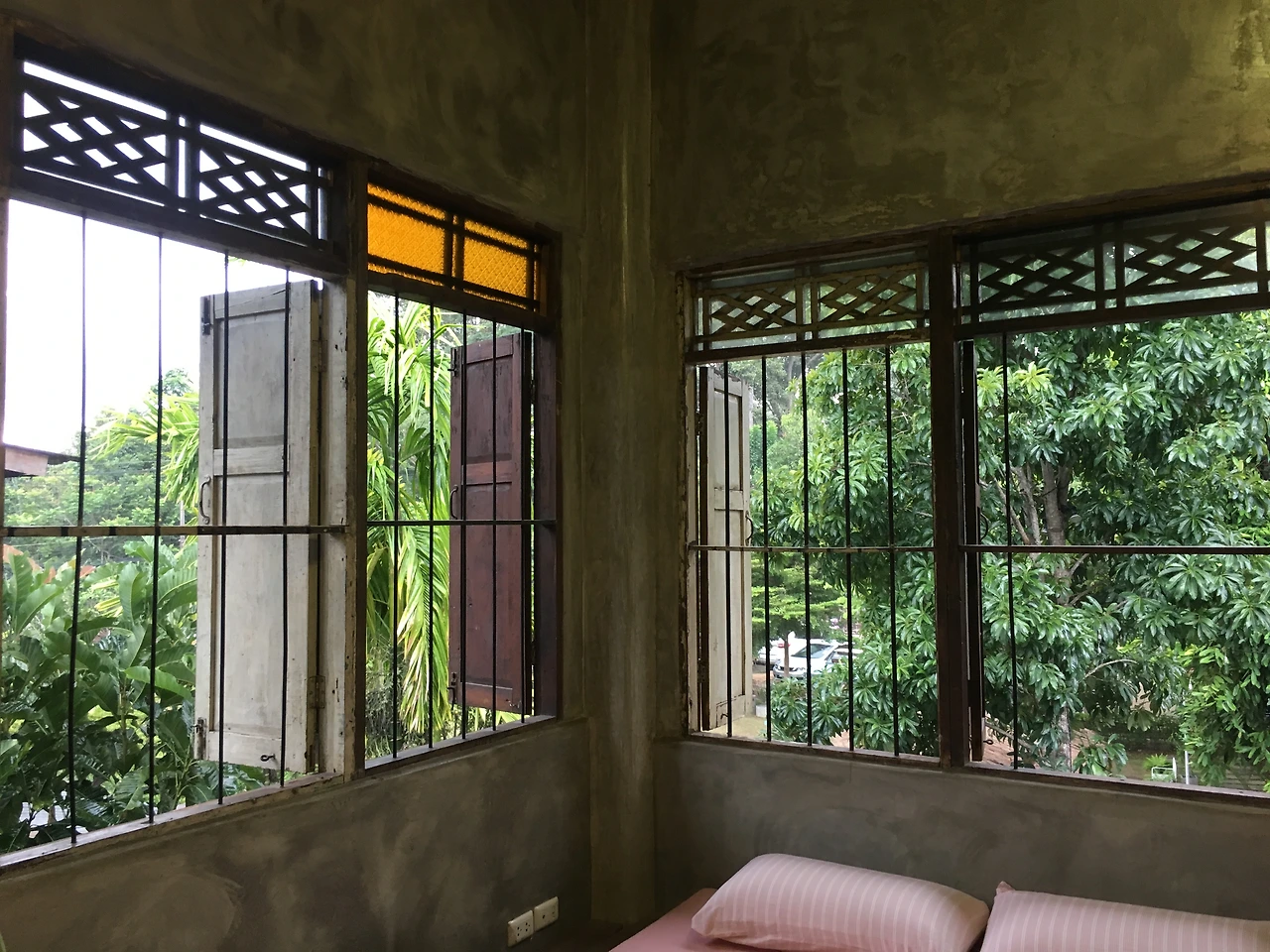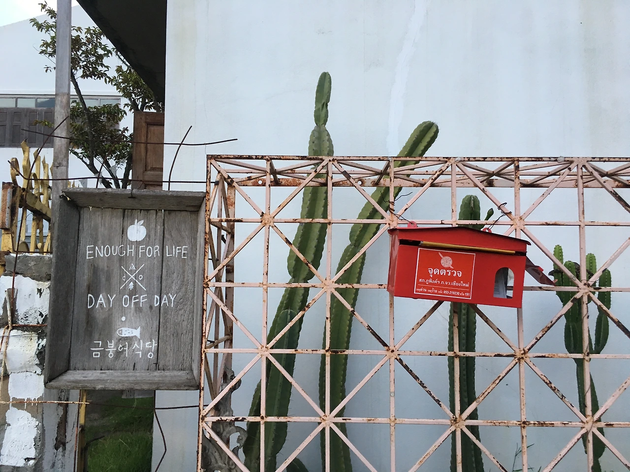 그랩을 불러 반캉왓, 치앙마이의 새로운 숙소로 향했다. enough for life. 여기 또한 매우 기대했던 숙소였다. '반캉왓'은 우리나라의 쌈짓길처럼 넓은 장소에 각종 상점들이 입점되어 있는, 인위적으로 조성해 놓은 작은 커뮤니티이다. 그중 ‘이너프 포 라이프’는 한국사람(과 태국사람)이 운영하는, 반캉왓 안에 유일의 숙박 시설이었다. 숙소에 들어오자마자 바깥 풍경 보이게 창문부터 활짝 열었다. 아마도 빠이의 영향 이리라. 덥지만 에어컨을 켜지 않고 사방의 창문을 활짝 열었다. 반캉왓도 꽤 푸르르구나. 창 밖으로 보이는 풍경이 또 여기는 여기대로 무척이나 사랑스러웠다.