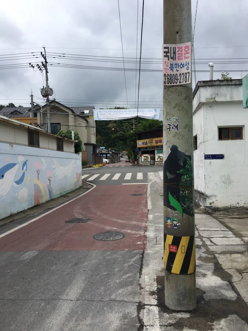 전봇대에 붙어 있는 결혼 광고. 익숙하게 '국제결혼'을 보다가 '국내 결혼'을 보니 낯설다. 참한 북한 여성이라니.