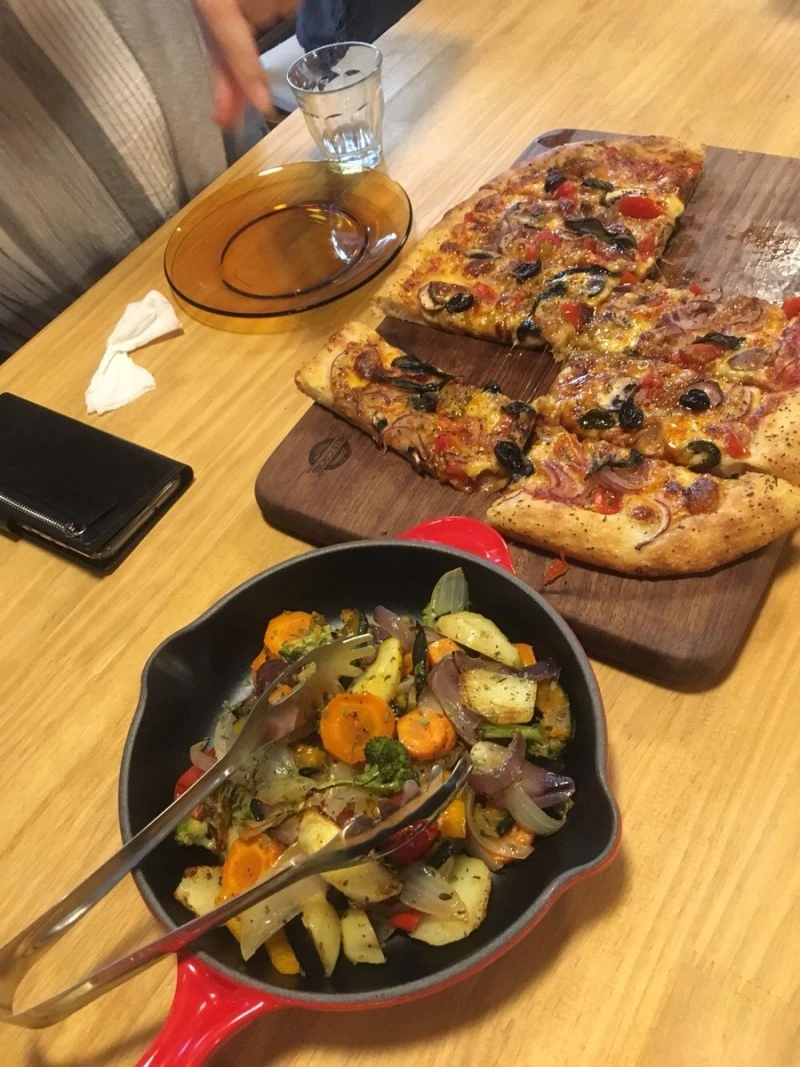 답사 후 저녁은, 폐교 안에 있는 근사한 공간에서 수제 피자와 샐러드를 먹었다. 유기농 재료를 듬뿍 넣은 우리 밀 발효 피자와 샐러드.정말 맛있었다. 정말 정말. 사실 모임의 타이틀은 매거진 편집 회의였는데 나는 아직 아무것도 모르니 그저 열심히 먹었다.