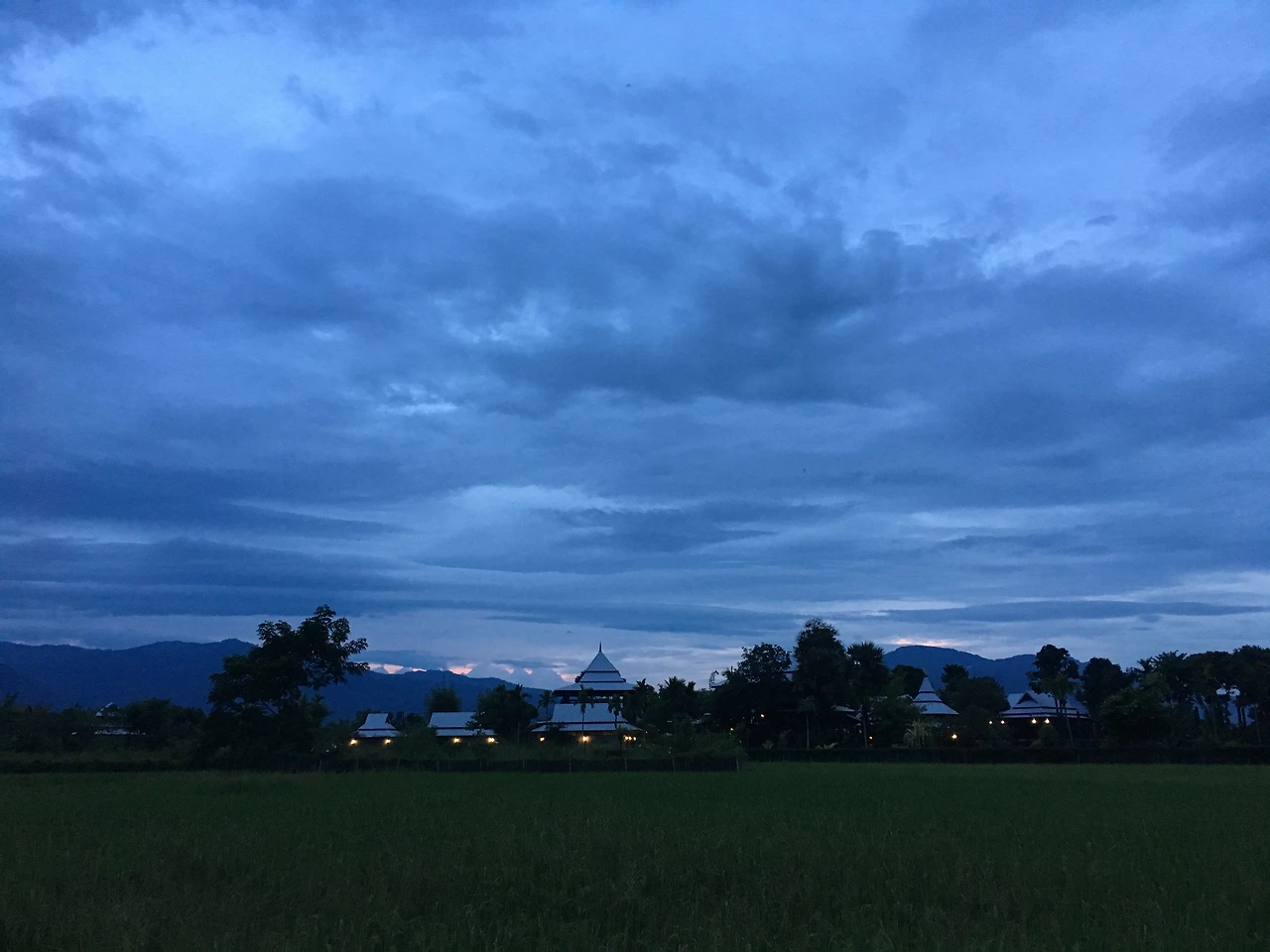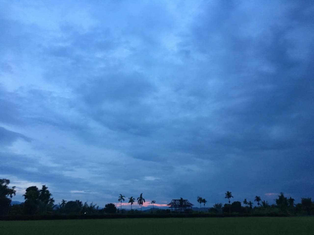 빛도 없는 시골길이니 해가 지기 시작하면 금세 칠흑 같은 어둠이 내렸다. 되도록 어둠 속에서 금방 들어올 수도록 리조트 근처 길에서 터덜거리며 선셋을 감상했다. 밝았던 하늘이 점점 어두워지며 짙은 파란색으로 물들기 시작하고 거의 20분 안에 완전히 깜깜해졌다. 지나가는 사람도 없는 논두렁에 혼자 서서 황홀한 풍경을 보고 있자니 조금 가슴이 찌릿찌릿했다. 뭔가 가슴을 찡하게 하는 곳이다. 이곳 매림은. 하, 예쁘다 참.