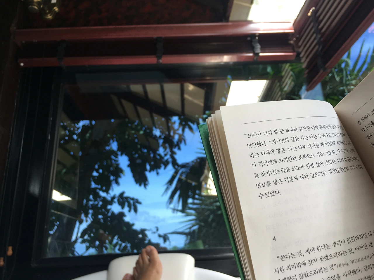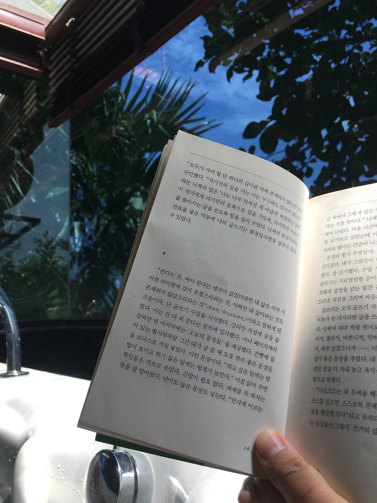 침대에 누워서 책을 읽다가 욕조에 물을 받아 욕조로 들어갔다. 짠짠 허세샷. 욕조 안 책 읽기는 이동진 기자님의 독서 방법으로 유명한데 한번 해보고 싶었다. 이 안에서 책을 읽으며 사진 속 풍경을 보는데 정말 호강하고 있는 기분이었다. 아 오길 잘했다. 한참만에 욕조에서 나와서 내려가 커피를 주문했다. 룸서비스로 아이스라테를 마셨다. 하, 정말 호강하는 기분의 연속.