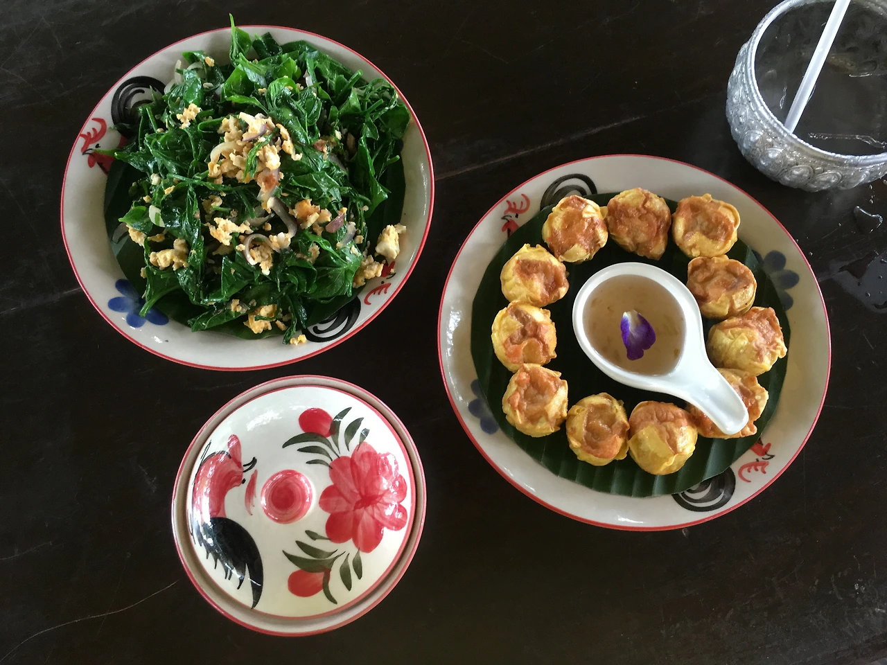타이 식당들은 이것저것 메뉴가 많기도 하고 죄다 못 먹어 본 낯선 것들이라 한 페이지씩 정독을 하다 보면 주문 시간이 엄청 늦어졌다. 그런데 언제고 서버들이 단 한 번이라도 재촉하거나 얼굴색이 변한 적도 없었다. 먼저 양해를 구해놓으면 얼마든지 맘 놓고 고르라고 한다. 한참, 독서하듯 메뉴판을 진지하게 탐독하고 고른 메뉴. 시켜놓고도 사실 뭔지 잘 모르겠다. 일단 애매할 땐 egg가 들어간 걸 골라야지. 계란 들어간 음식치고 맛없는 거 못 봤다. 계란이랑 모닝글로리를 함께 볶은 메뉴와 무난해 보이는 wonton, 완탕을 시켰다. 완탕면 할 때 그 완탕.