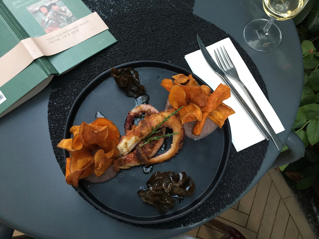 미리 예약을 해놓은 시간에 맞춰 도착했다. 내 기준으로는 늦은 저녁인데, 이 식당은 저녁 예약이 7시 30분부터 됐다. 저녁 식사를 늦게 시작한다고 들었다. 아니나 다를까 아직 사람이 많지 않았다. 실내도 깔끔하게 괜찮지만 야외 테라스 자리가 더 인기 있는 듯, 곧 식사를 하려는 사람들로 꽉 찼다. 분위기는 나쁘지 않았다. 관광객보다는 현지인이 많아 보였다. 뭐, 유명한 곳이 아니라 그런 걸 지도. 샐러드와 화이트 와인, 문어 요리를 시켰다. 샐러드 나쁘지 않았고, 와인 맛은 워낙 잘 모르고. 문어 요리 맛있었다.