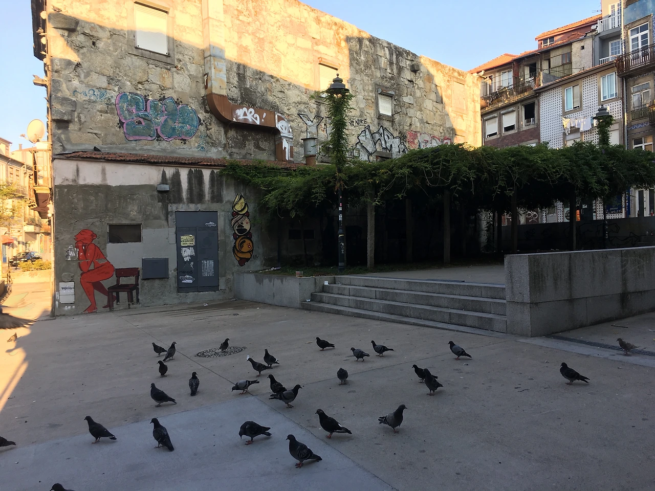 아직 이른 아침, 길에는 사람보다 비둘기와 갈매기가 더 많다.