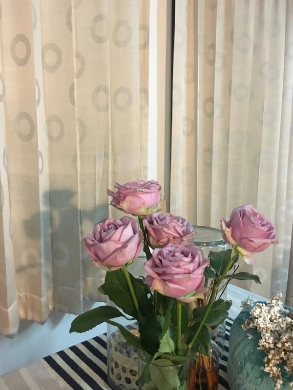 나는 듯한 걸음으로 집으로 돌아왔다. 컵을 씻고 물을 채우고 과도로 꽃대를 비스듬히 잘라 컵과 키를 맞췄다. 창 밖 풍경이, 식탁 위 풍경이 한결 풍성해졌다. 이 곳이 더 앉아 있고 싶은 장소가 되어버렸다. 이렇게 꽤 풍성하고 괜찮은 꽃이 무려 75밧. 2700원 조금 안 되는 가격 되시겠다. 하. 이러니 내가 안 살 이유가 없지. 꽃 하나 꽂아두고 어찌나 행복해졌는지. 음악을 틀고 테이블 위를 치우고 방을 정리하고, 주말의 오후를 즐겼다.