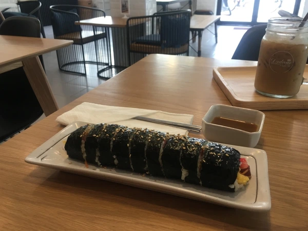 어제 숙소 근처를 산책하면서 발견한 카페에서 낯익은 김밥 사진을 발견하고, 아침부터 김밥을 먹으러 왔다. 식당이라기보다는 카페 같은 분위기에 음료가 주된 판매 대상이지만 생뚱맞게 김밥과 떡볶이를 판다. 카페 안에는 한국 분이 계실 줄 알았는데, 태국 언니가 환하게 웃으며 맞아줬다. 미심쩍은 마음으로 김밥과 아이스라테를 주문했다. 태국 언니가 하나하나 재료를 넣어 김을 마는 모습을 생각하니 이거 괜찮겠나 싶었지만, 아주 오-래 걸려서 나온 김밥은 깨까지 오솔오솔 뿌려져 있었다. 일단 비주얼 합격. 이거 이거 우리나라 김밥 천국 아주머니 김밥 마는 속도 보면 놀라 자빠지겠구먼. 맛은 보통, 나쁘진 않았다. 오이 넣은 김밥인데 내 취향은 시금치라서 그걸 제외하고는 꽤 담백하니 맛있었다. 파는 김밥보다는 소풍 때 집에서 싸주는 집 김밥의 느낌이 났던 건 왜 때문일까. 공부하는 분위기의 조용한 카페였다. 재미있게도 작은 간장 종지에 자른 김밥 하나씩을 담아서 시식 서비스도 했다. 태국 사람들 입맛에 김밥은 어떨까.