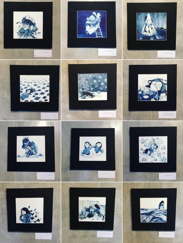 나중에 인스타를 검색하다 발견, 고등학생으로 보이는 귀여운 서점 언니는 알고 보니 아티스트였다. 그것도 마침, 내가 반캉왓에 머물고 있을 때, 'gallery kang wat'에서 전시 중이어서 구경했었던 전시, 'today is Blue Day'의 작가님. 자기와 똑같은 잠자리 안경 쓴 소녀가 잔뜩 등장하는 그림의 작가님이었다. 치앙마이 참 좁다. 어쩜.