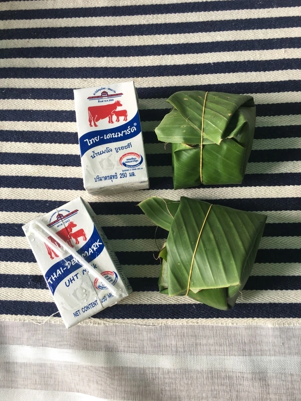메세지를 확인해보니 이건 이틀치라고 밥은 내일까지 먹고, 우유는 시리얼과 함께 먹으란다. 근데 이거 좀 귀엽다. 팩우유에 바나나 잎에 쌓여진 태국 삼각 주먹밥도.