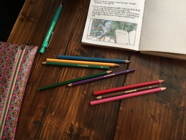 새로 산 수첩에 쓰기 시작한 여행 일기. 손으로 쓰는 걸 안 좋아해서 왠만하면 일기는 잘 안쓰는데 언제가부터 무료함을 이기지 못하고 소일거리(?) 삼아 쓰기 시작했다. 열심히 따라잡았지만 아직 일주일 전 매림의 일기다. 마침 카페에 색연필이 있어서 신나게 그림에 색칠까지. 발로 그린 그림이지만 너무 인상 깊었던 욕조 샷은 말보다는 그림이 제격이라.