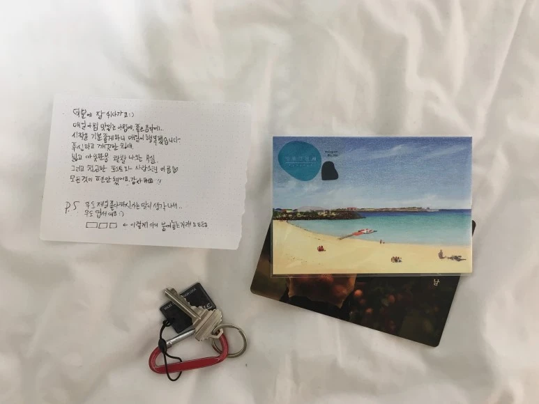 우도를 좋아한다는 호스트에게 우도 엽서를 남겼다. 세 장짜리 엽서를 가로로 이어붙이면 길게 뻗은 해변 풍경이 그대로 그려져있는 엽서였다.